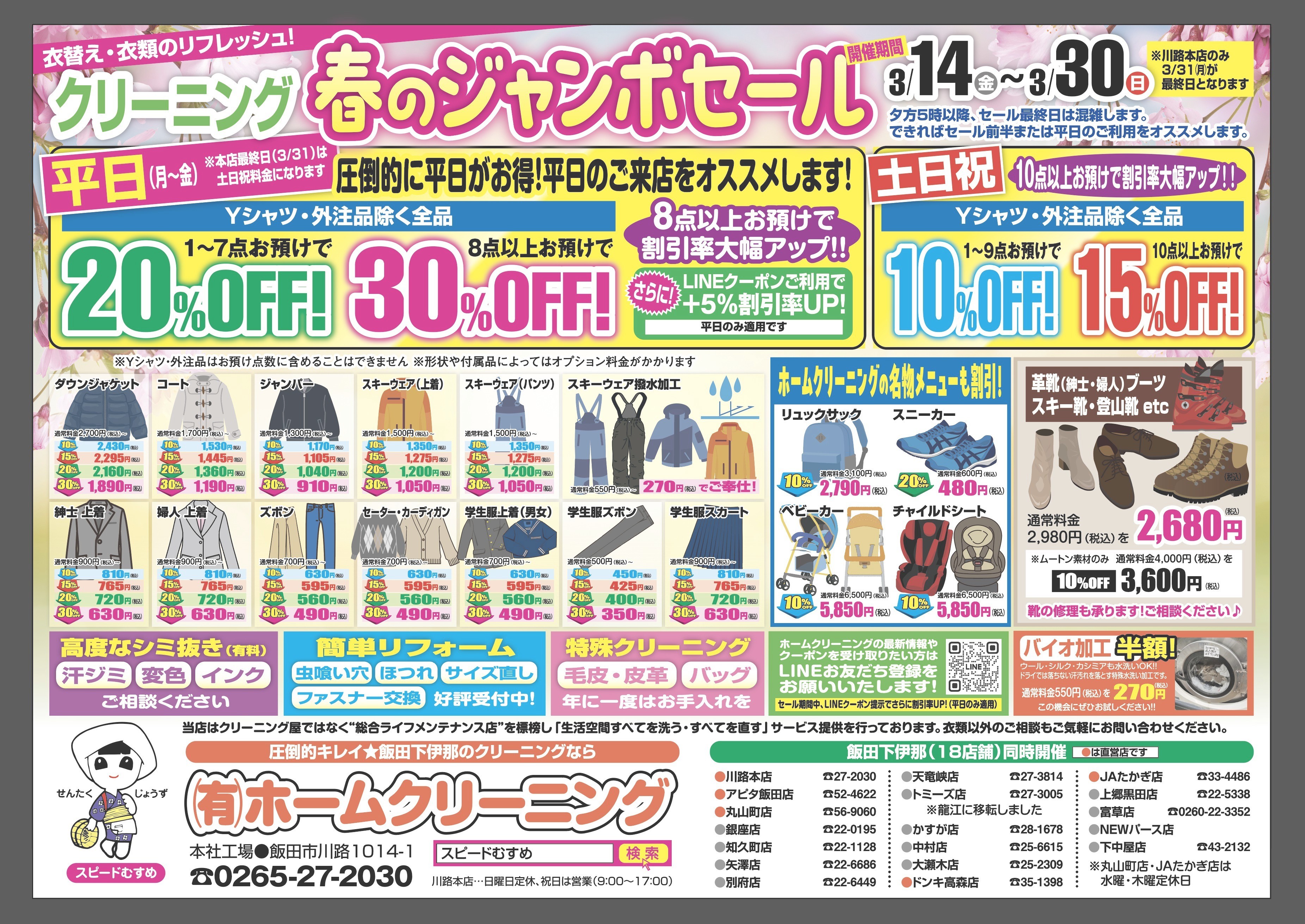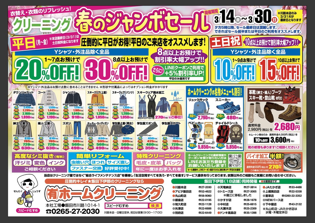 3月14日(金)~3月30日(日)までホームクリーニング全店にて「春のジャンボセール」を開催いたします。※川路本店のみ3月31日(月)が最終日になります。