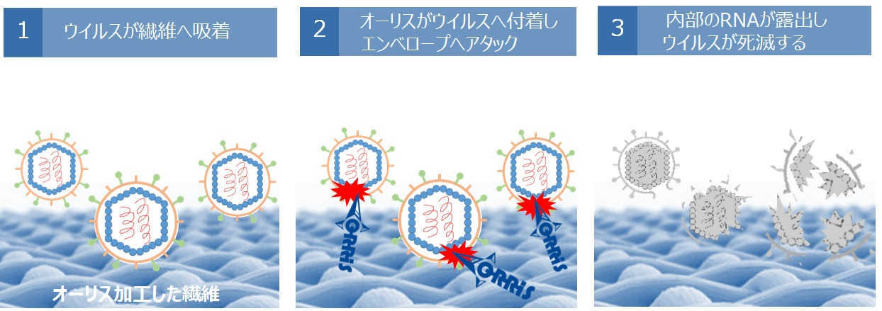 当社のクリーニングはドライ・水洗いすべてのクリーニング時の洗剤に日華化学製の高性能抗ウイルス洗剤「オーリス」洗剤を導入。JIS L1922 繊維製品の抗ウイルス性試験にて生地上のウイルス減少を証明しています。なお、この「オーリス」による抗ウイルス・抗菌作用は仕上り時だけでなく加工後も抗ウイルス・抗菌作用が一定期間持続することが分かっています。